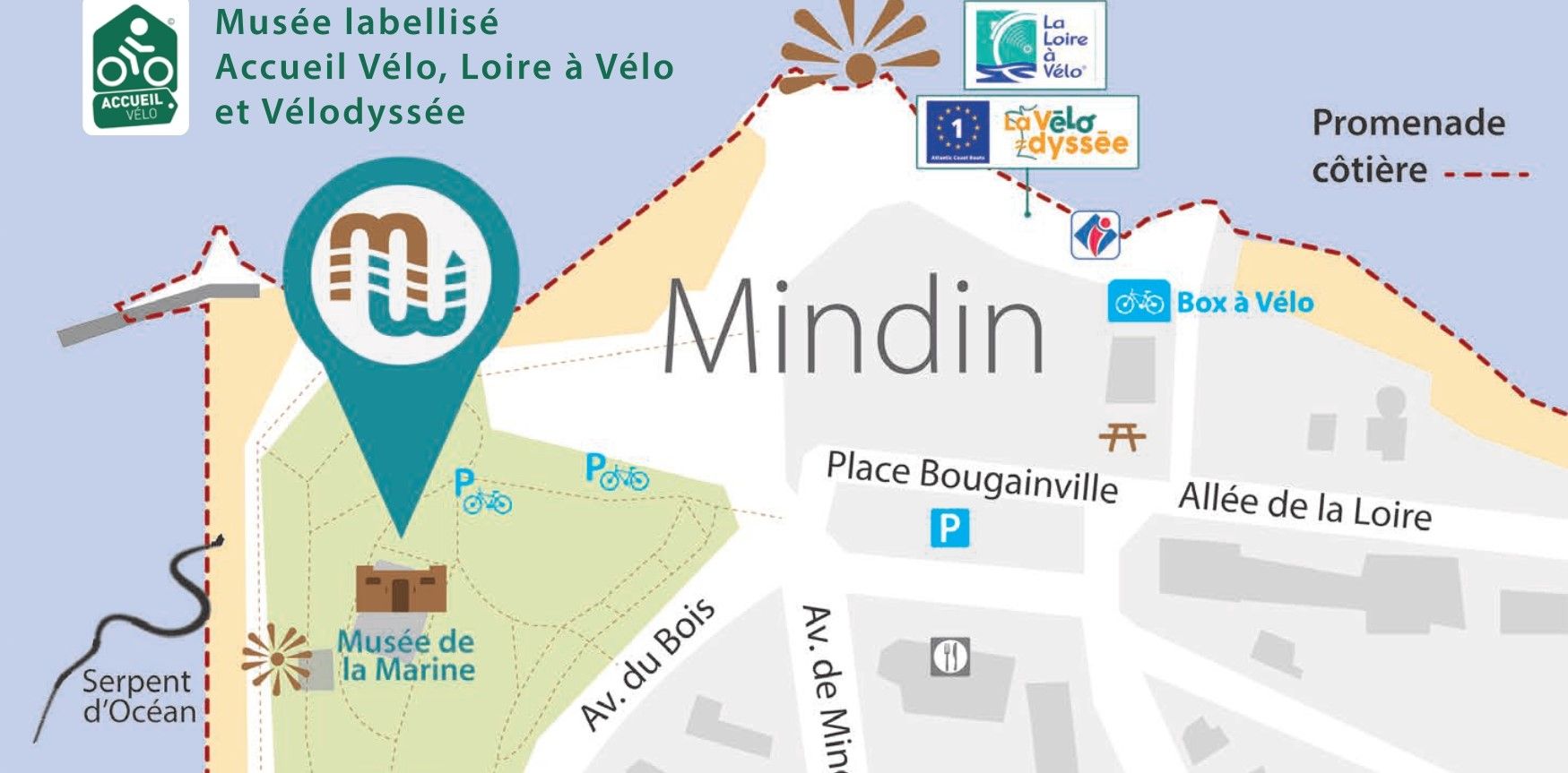 Le musée de la marine de Mindin est labellisé Accueil Vélo. Il vous est proposé un parking à vélos, une fontaine à eau et le nécessaire pour réparation (rustine, colle...)